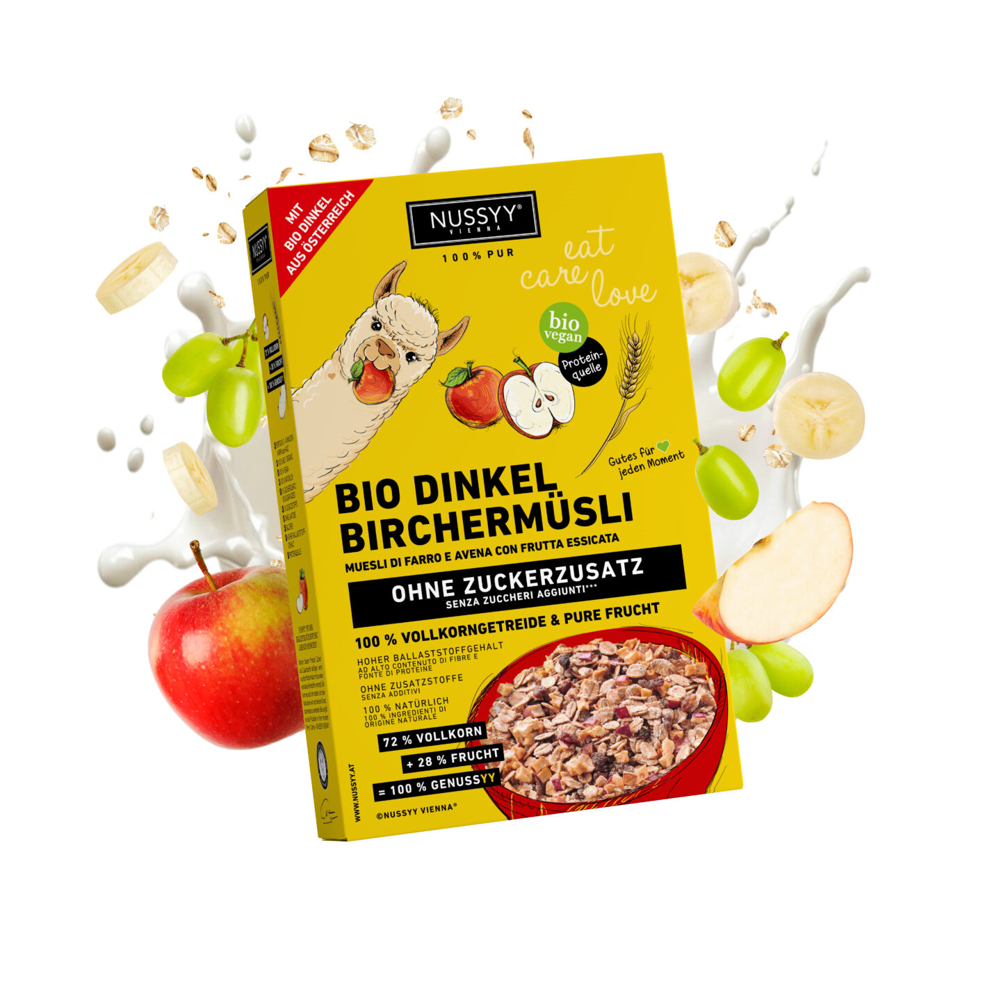 Genieße das NUSSYY® BIO DINKEL BIRCHERMÜSLI aus erlesenen Zutaten mit 72 % BIO Vollkorn-getreide und 28 % BIO Früchten als tägliches, herzerwärmendes GUTEN-MORGEN-FRÜHSTÜCK oder kleine MUNTER-MACHER Zwischenmahlzeit. Nach Belieben mit geriebenen Äpfeln, frischen Früchten, Nüssen, Gewürzen oder Joghurt verfeinern und sofort genießen.