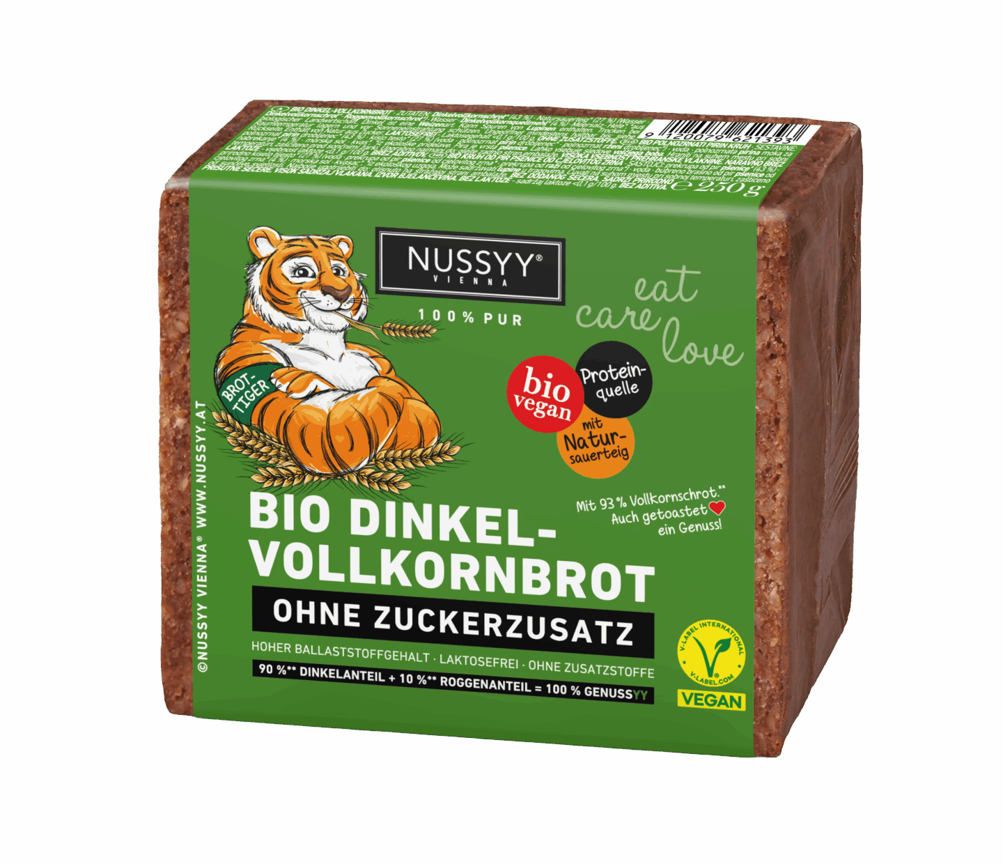 Genieße das NUSSYY® BIO DINKEL-VOLLKORNBROT MIT PROTEINQUELLE am Frühstückstisch mit der Familie, als vollwertige Jause unterwegs oder auch als veganen Genussmoment zum Abendbrot. Aus hochwertigem NATURSAUERTEIG und dem vollen Korn gewonnen, harmoniert das traditionell-vollwertige BIO DINKEL-VOLLKORNBROT MIT PROTEINQUELLE perfekt mit Deinem Lieblings-Aufstrich, Käse und knackig-frischem Gemüse – auch getoastet ein idealer Genuss für alle ernährungsbewussten Brot- und Proteintiger!