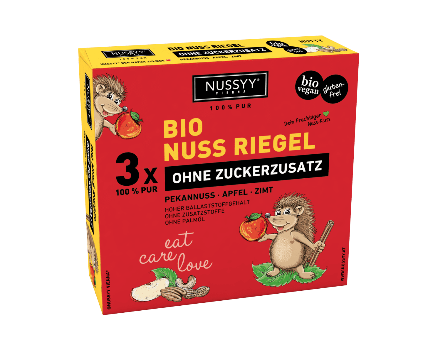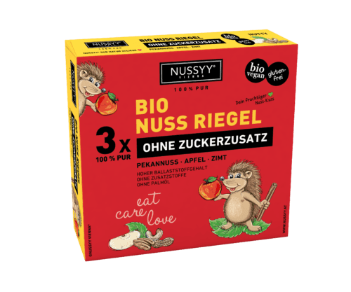 3-fach stark & 3-fach köstlich! Der NUSSYY® BIO NUSS RIEGEL · NUTTY ist Dein fruchtig freudiger, GLUTEN-FREIER Nuss-Kuss aus den zauberhaften Hallen unserer BIO Riegelmanufaktur. Dank sorgfältig ausgewählter, LAKTOSEFREIER Rezeptur kommen Nussliebhaber allen Alters auf Ihre Kosten. Von unseren Riegelexperten liebevoll aus mild gerösteten BIO Erdnüssen, BIO Pekannüsse sowie feinen BIO Cashews kreiert, ist das Glück perfekt, wenn Apfel und Zimt Deinem Gaumen schmeicheln. Im coolen NUSSYY® Multipack gebündelt, passen die nussigen Leckerbissen in jede Schul-, Sport- oder Reisetasche. Sie sind perfekt zum Snacken zwischendurch oder als Begleiter mit Energie-Kick-Qualitäten bei aufregenden Outdoortouren. On Top punktet das goldgelbe NUSSYY® BIO Wundertrio ganz OHNE ZUCKERZUSATZ, FREI VON ZUSATZSTOFFEN, OHNE PALMÖL und mit HOHEM BALLASTSTOFFGEHALT. Starte in ein köstliches Abenteuer und erfreue Dich an Deiner Extraladung wohltuender Apfel-Nuss-Power!